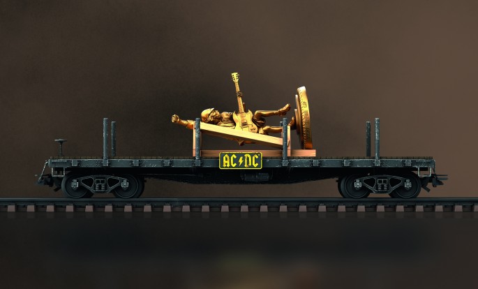 Die dort abgefeuerten Kanonen fanden AC/DC so cool, dass sie diese zunächst als Effekt für den Song und später als Showelement für ihre Konzerte übernahmen. Zahlreiche Konzerte starteten seither mit dem Glockenspiel des Songs HELLS BELLS und endeten mit den würdigen Salutschüssen. Selbstverständlich dürfen die Kanonen auch im Modell von Märklin nicht fehlen. Ein Rungenwagen aus Metall transportiert die Kultobjekte von Auftritt zu Auftritt. For those about to play – we salute you!
